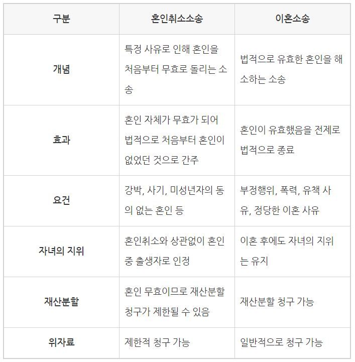 A: 이혼은 유효하게 성립된 혼인을 해소하는 것이지만, 혼인취소는 특정 사유가 인정될 경우 처음부터 혼인이 무효로 간주되는 효과가 있습니다.