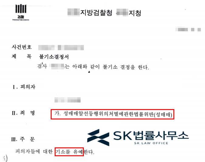 검찰은 본 변호인의 주장을 받아들여 성매매알선등행위의처벌에관한법률위반(성매매) 혐의에 대해 불기소(기소유예) 결정하였습니다.SK 법률사무소의 강점