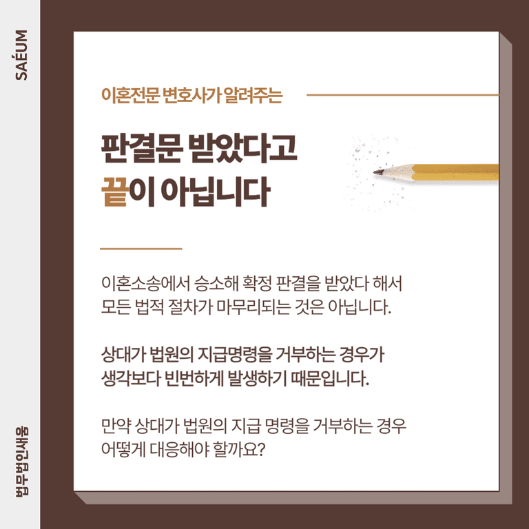 이혼소송에서 승소하여 확정판결을 받았다고 해서 모든 법적 절차가 자동으로 마무리되는 것은 아닙니다. 법원의 판결에 따라 일정한 금액을 지급해야 함에도 이를 이행하지 않는 사례가 빈번하게 발생합니다.