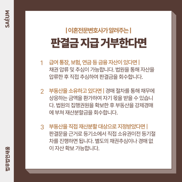 이에 대비해, A씨는 법무법인 새움의 이혼전문변호사와 함께 소송을 진행하면서 미리 재산에 대한 가압류 가처분 신청을 진행하였습니다. 실제로 대법원 판결이 확정된 이후에도 남편은 끝까지 지급을 거부하였고, 결국 판결금 강제집행 절차에 들어가게 되었습니다.