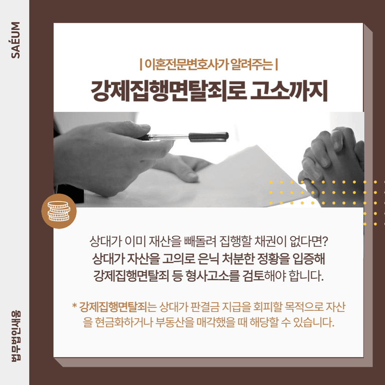 금전으로 재산분할을 받기로 했음에도 상대방이 기한 내 지급하지 않는다면, 앞서 설명한 채권압류 및 추심 절차를 통해 강제집행이 가능합니다. 그러나 상대방이 사전에 현금을 찾거나 재산을 빼돌려 집행할 채권이 없다면 어떻게 해야 할까요?