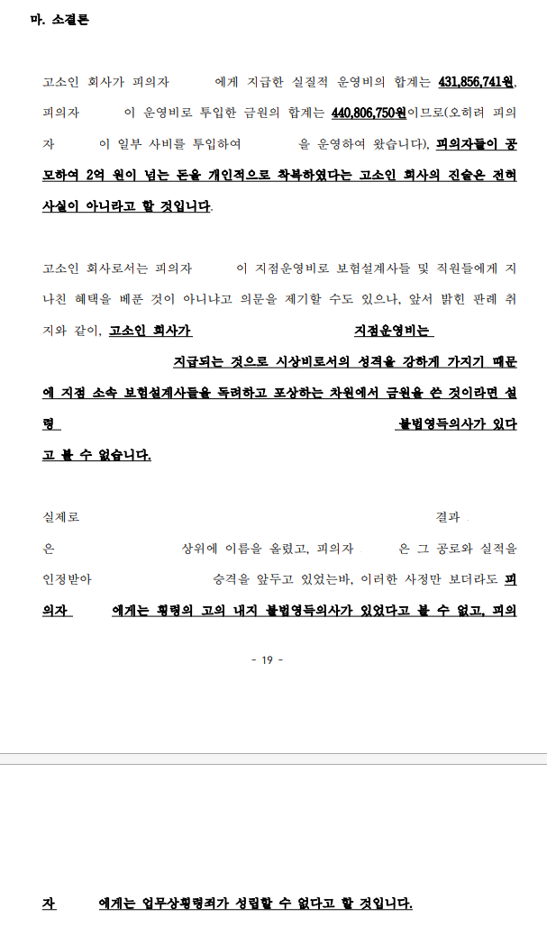 고소인 회사로부터 받은 운영비를