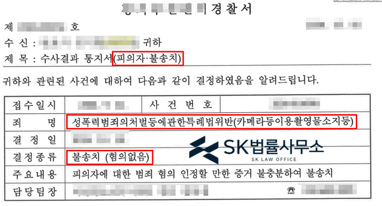 경찰은 본 변호인의 주장을 받아들여 성폭력범죄의처벌등에관한특례법위반(카메라등이용촬영물소지등) 혐의에 대해 불송치(혐의없음) 결정하였습니다.SK 법률사무소의 강점
