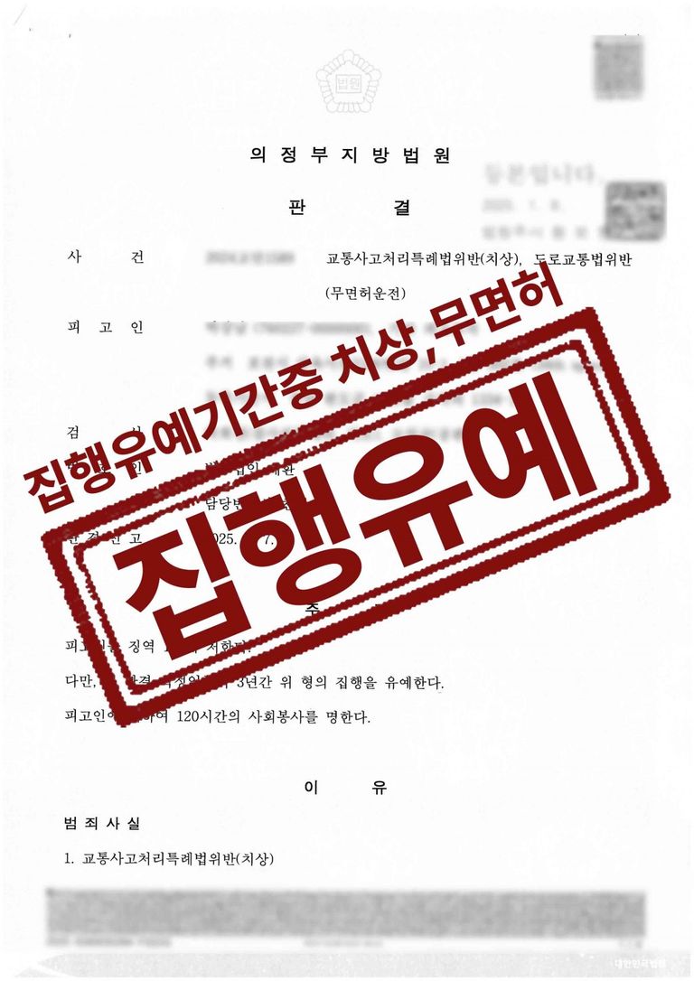의뢰인은 생계유지를 위해 어쩔 수 없이 무리하게 운전을 해야만 했던 상황이었음을 주장하고 범행을 충분히 인정하고 반성하고 있었다는 점을 주장하였고, 피해자들이 입은 피해가 전치2주 정도로 피해가 크지 않다는 점, 무면허운전이지만 자동차보험에 가입했다는 점 등을 종합적으로 주장하였습니다. 피해자들이 합의를 해주지 않고 처벌을 원했고 집행유예기간에 일어난 범죄라는 점, 동종범죄로 과거 벌금형을 선고 받았다는 점 등 불리한 점도 많았지만 재판부에서는 의뢰인의 손을 들어 집행유예를 선고하였습니다.