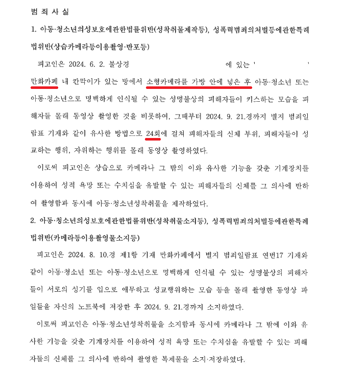 A씨는 2024. 6. 2.경부터 2024. 9. 21.경까지 총 24회에 걸쳐 만화카페에서 소형카메라를 가방에 숨겨 옆방에 밀어넣는 방법으로 미성년자들을 몰래 촬영하다가 적발되어 조사를 받게 되었습니다.