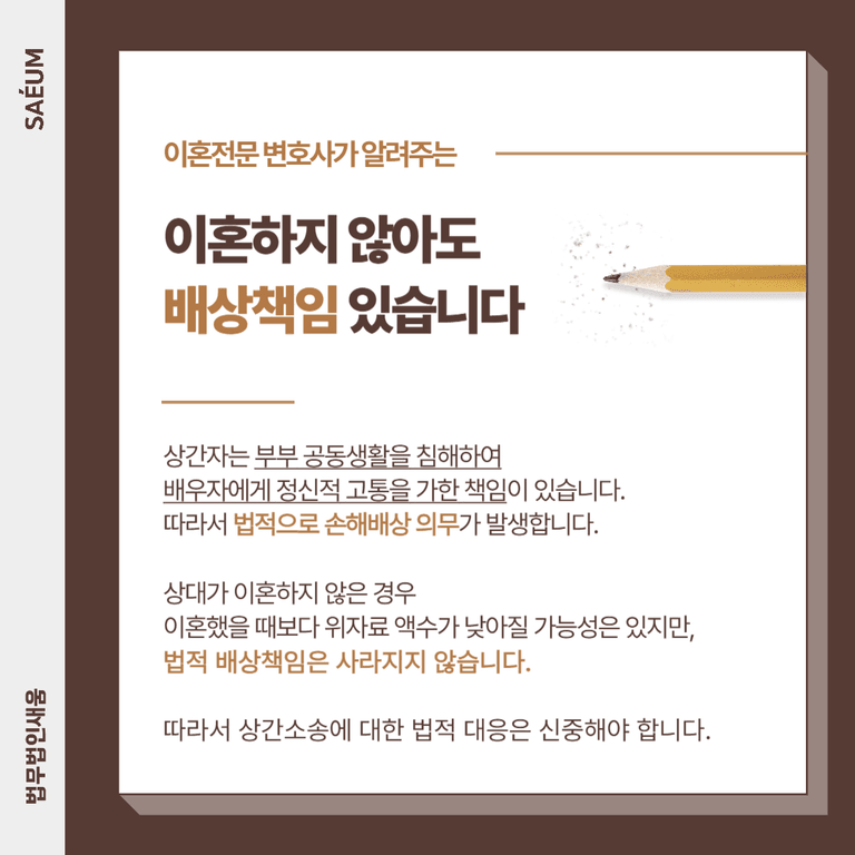물론 이혼하지 않은 경우에는 이혼했을 때보다 위자료 액수가 다소 낮아질 가능성은 있지만, 그렇다고 해서 배상책임이 사라지는 것은 아닙니다. 따라서 이혼 여부와 관계없이 상간자 소송에 대한 법적 대응을 신중하게 준비해야 합니다.