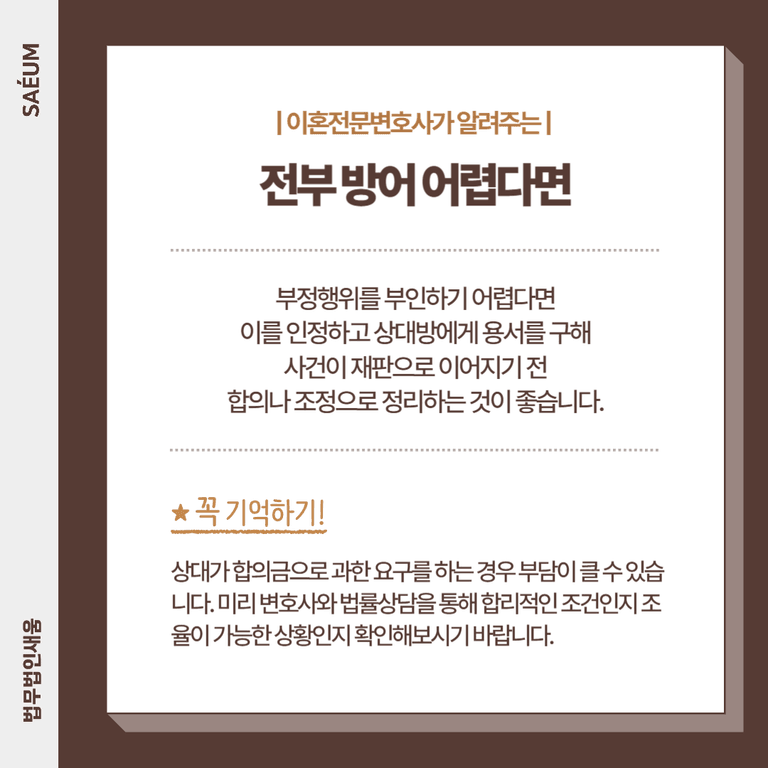 따라서 부정행위를 부인하기가 어렵다면 차라리 빠르게 인정하고 상대방에게 사과한 후 용서를 구하여 사건이 재판까지 이어지는 것을 막아보시는 것이 좋습니다. 물론 상대방과 합의하거나 조정을 하기가 쉬운 일은 아닙니다. 상대방이 너무 과한 조건을 요구하는 경우 부담이 더 커질 수 있으므로 사전에 변호사를 선임하여 조건이 합리적인지, 조율이 가능한 상황인지 등을 살펴보고 도움을 받아 보시는 것이 좋습니다.