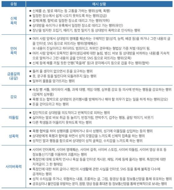 학교폭력이란 「학교 내외에서 학생을 대상으로 발생한 상해, 폭행, 감금, 협박, 약취·유인, 명예훼손·모욕, 공갈, 강요·강제심부름, 성폭력, 따돌림, 사이버폭력 등에 의하여 신체·정신·재산상 피해를 수반하는 행위」를 말합니다.