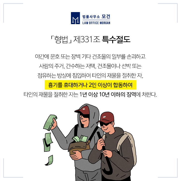 특수절도죄는 흉기를 휴대하거나 2인이 합동하여 타인의 재물을 절취한 때 적용되는 것으로, 일반 절도죄와 달리 벌금형 없이 1년 이상 10년 이하의 징역으로 처벌된다는 특징이 있습니다.