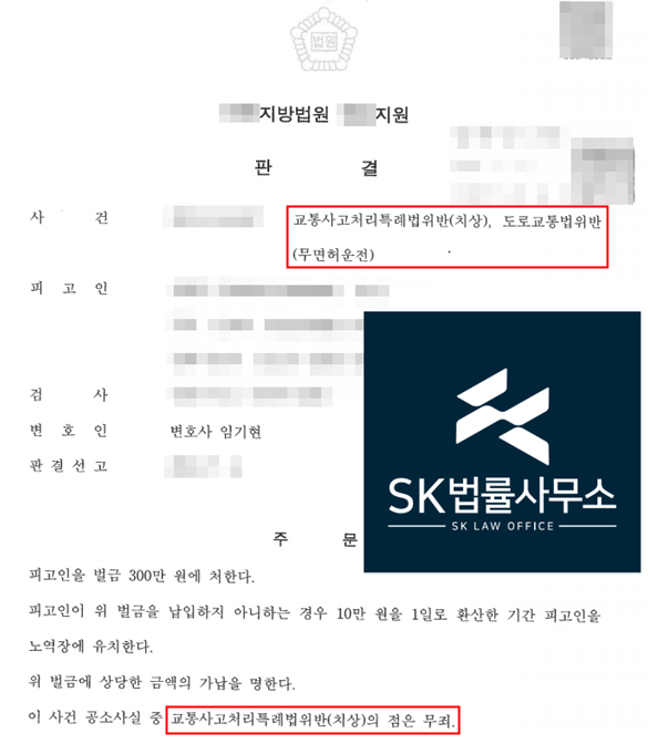 법원은 본 변호인의 주장을 받아들여 교통사고처리특례법위반(치상)에 대하여 무죄 도로교통법위반(무면허운전)에 대하여 벌금 300만원을 선고하였습니다.SK 법률사무소의 강점