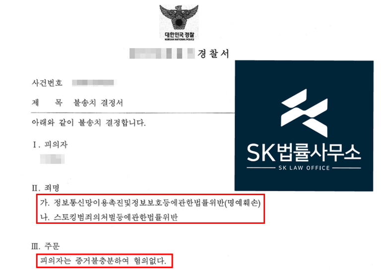 경찰은 본 변호인의 주장을 받아들여 스토킹범죄의처벌등에관한법률위반 및 정보통신망이용촉진및정보보호등에관한법률위반(명예훼손) 2개 혐의 모두 불송치(증거불충분) 결정하였습니다.SK 법률사무소의 강점