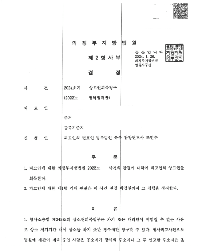 의정부지방법원은 변호인의 의견을 수용하여 상고권회복청구를 인용하였음. 의뢰인은 공판 집행을 전혀 알지 못한 채 체포되어 확정된 형을 살고 있었으나, 위 변호인의 적극적인 변론에 따라 상고권이 회복되고, 위 판결(징역 8월)에 대한 집행이 정지되어 다시 재판을 받을 수 있게 되었음.