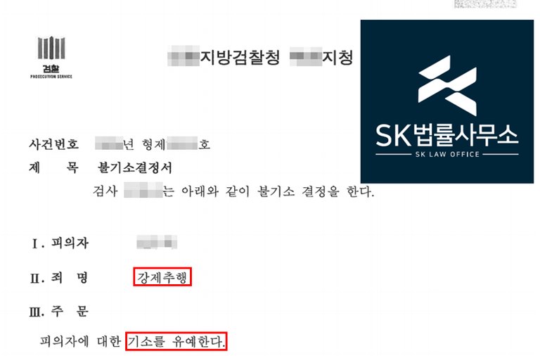 검찰은 본 변호인의 주장을 받아들여 강제추행 혐의에 대해 불기소(기소유예) 결정하였습니다.SK 법률사무소의 강점