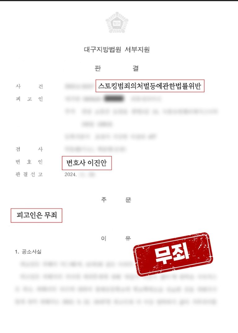 그중 오늘 준비한 포스팅은 스토킹 재판에 넘겨진 의뢰인을 조력하여 무죄를 받아낸 사례입니다. 저는 다수의 형사사건에서 무죄를 받아낸 경험을 보유하고 있습니다. 1심 무죄율이 1% 조차 되지 않기에 매우 괄목할 만한 이력이죠.