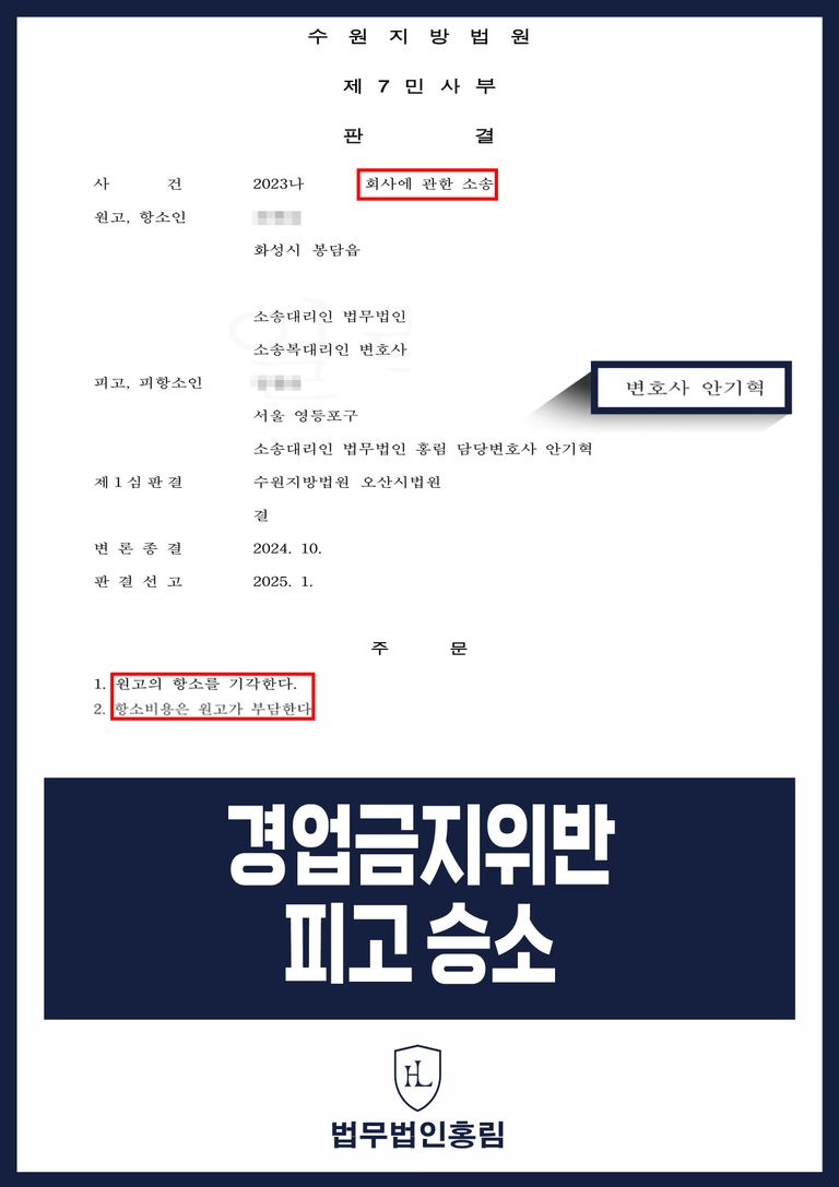 그 결과 법원 측에서는 변호인의 의견을 받아들여, 원고가 제출한 증거만으로는 원고에게 손해가 발생한 사실을 인정하기에 부족하고, 또한 경업금지의무 위반시 작성하였던 계약내용이 약정금이라고 인정하기 어렵기에 '항소기각 및 소송비용 부담하라'고 판시하였습니다.