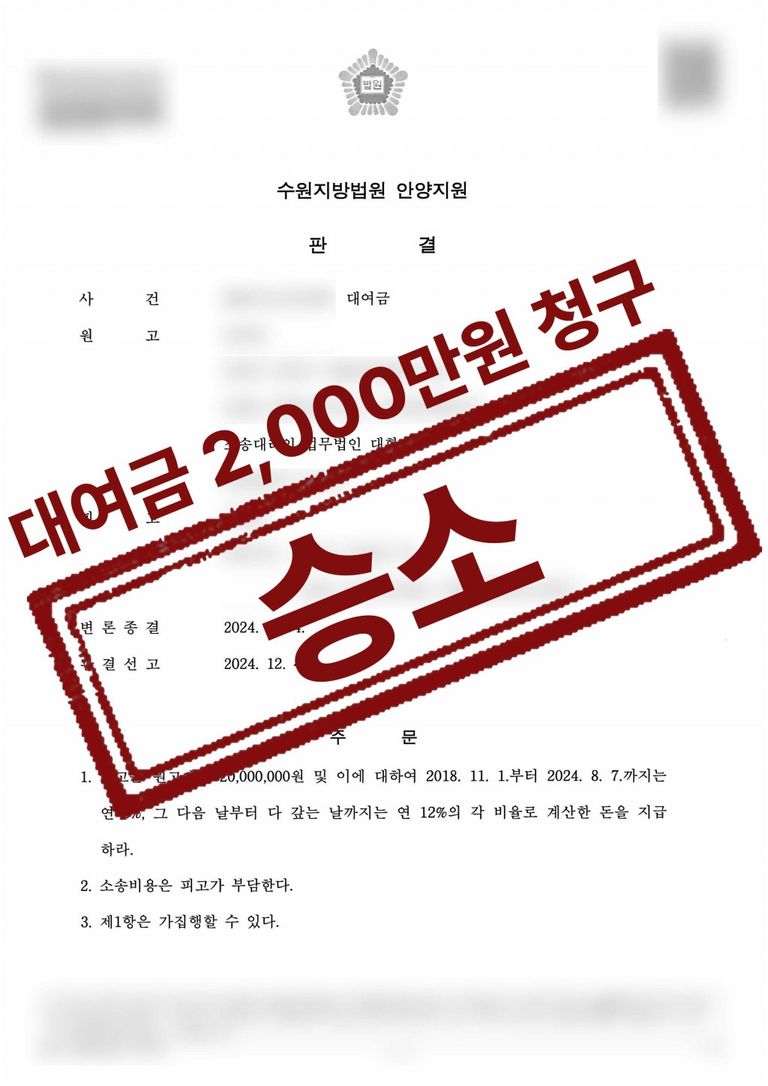 법무법인 대환은 사건 검토 결과, 차용증은 없었지만 돈을 빌려갔다는 메시지 기록과 언제까지 갚겠다는 내용 등이 기재되어 있었고, 은행 이체내역도 있었습니다. 많은 분들이 차용증이 없으면 잠적해도 못 받을 것이라고 생각하십니다만, 전혀 그렇지 않습니다. 위와 같이 명확한 증거들을 충분히 찾아낼 수 있으며 받아낼 수 있습니다. 결과적으로 대여금반환청구소송에서 2천만 원 전액과 소송비용을 피고가 부담하는 것으로 전부 승소하였습니다.
