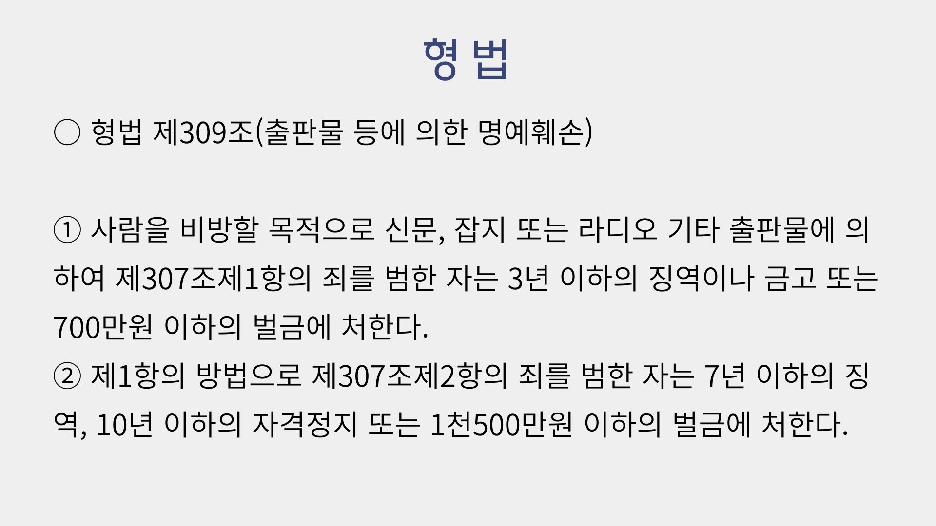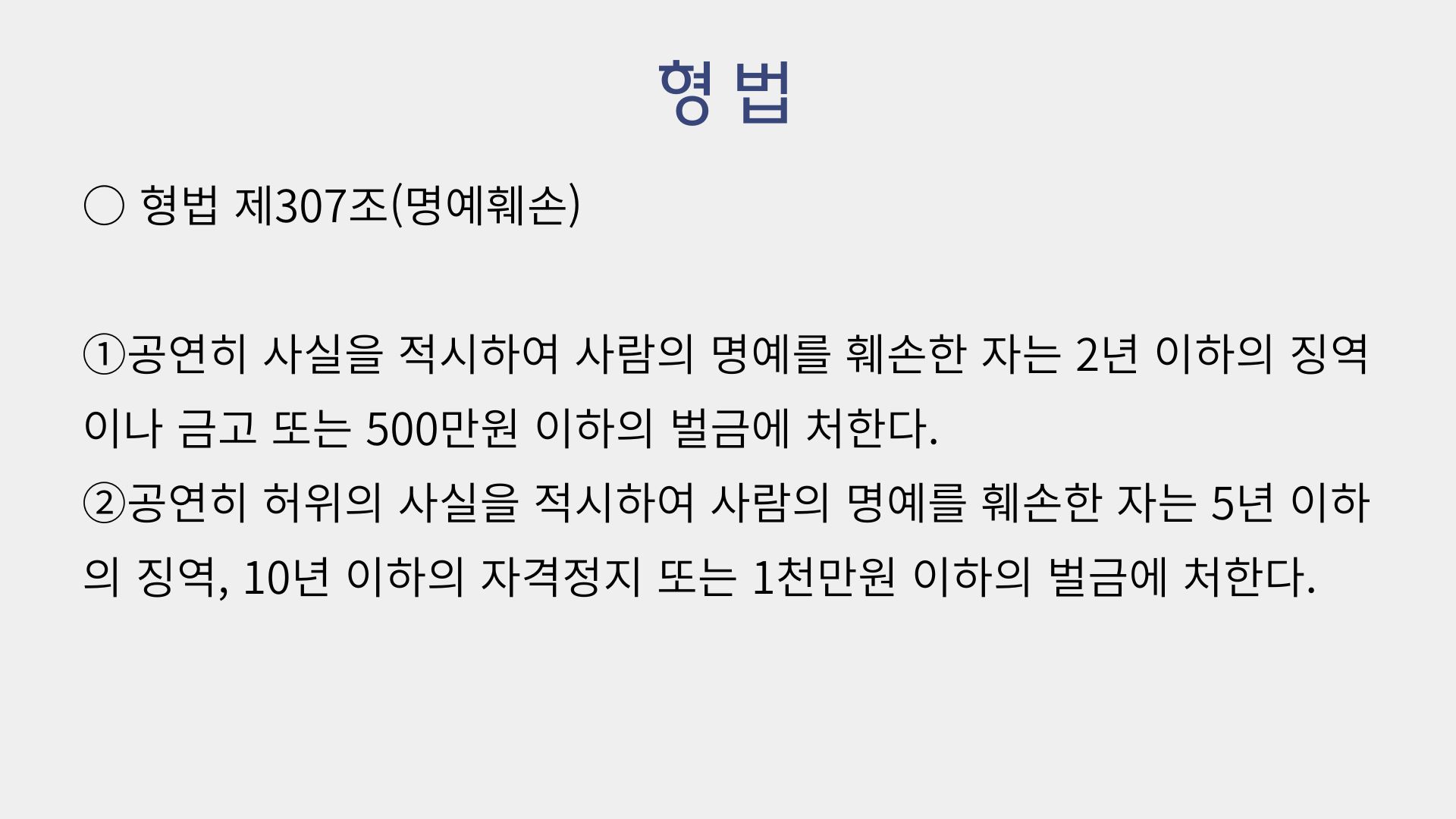 형법 제307조는 사실(또는 허위 사실)을 적시하여 사람의 명예를 훼손한 자를 처벌하도록 규정하고 있습니다.