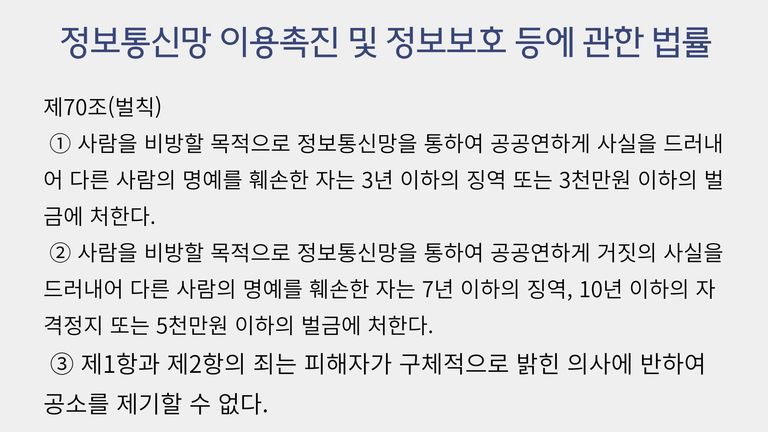 최근 명예훼손 행위는 대부분 인터넷 게시판, 카카오톡 등 정보통신망을 통해 일어나고 있으며, 이 경우 정보통신망 이용촉진 및 정보보호 등에 관한 법률 제70조 위반 혐의가 적용됩니다.