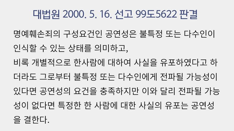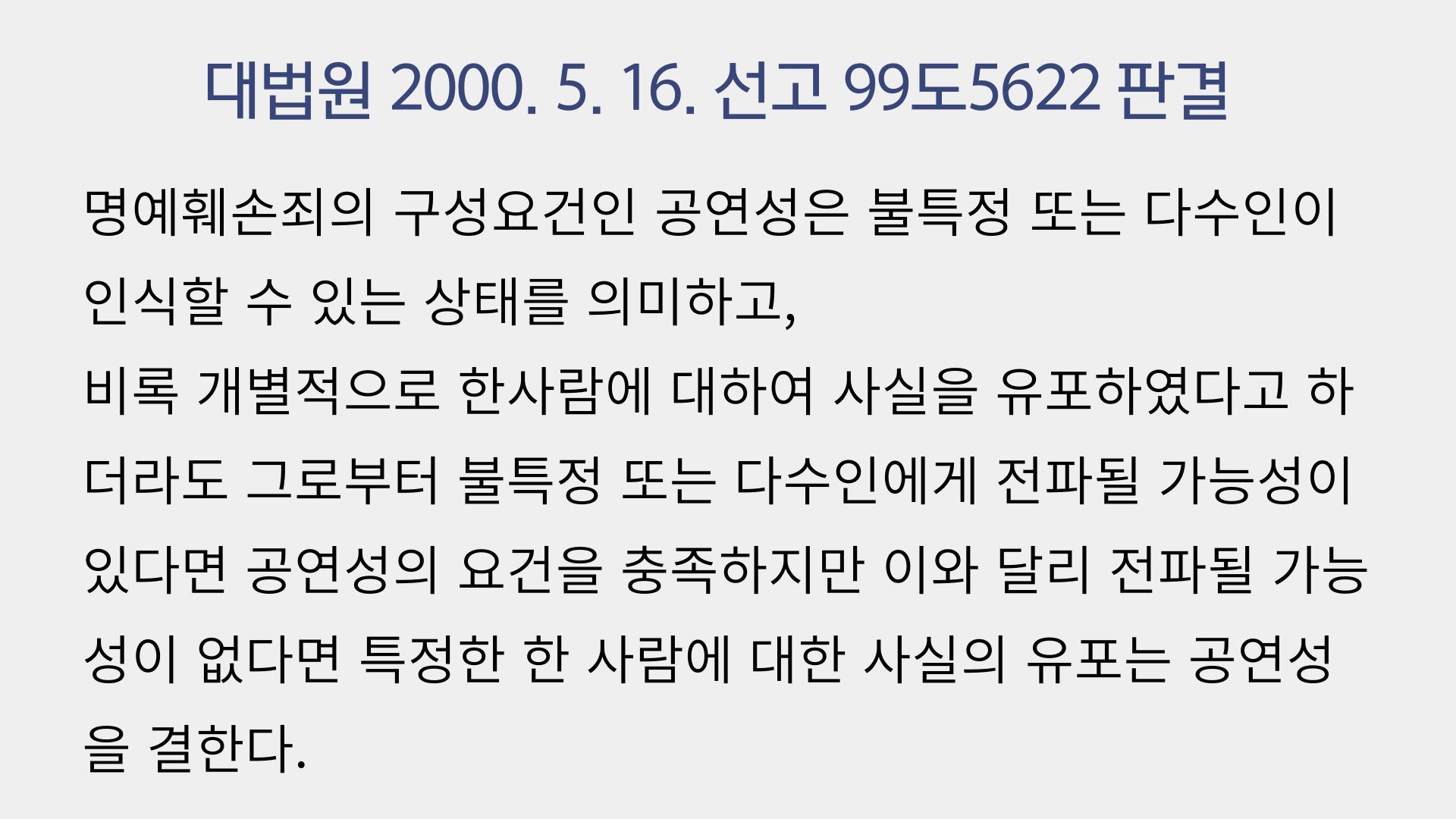 하지만 대법원 판례는 ‘전파성이론’을 인정하여, 개별적으로 한 사람에 대하여 사실을 유포하였다고 하더라도, 그 사람으로부터 불특정 또는 다수인에게 전파될 가능성이 있다면, 공연성의 요건을 충족하는 것으로 판단하고 있습니다.