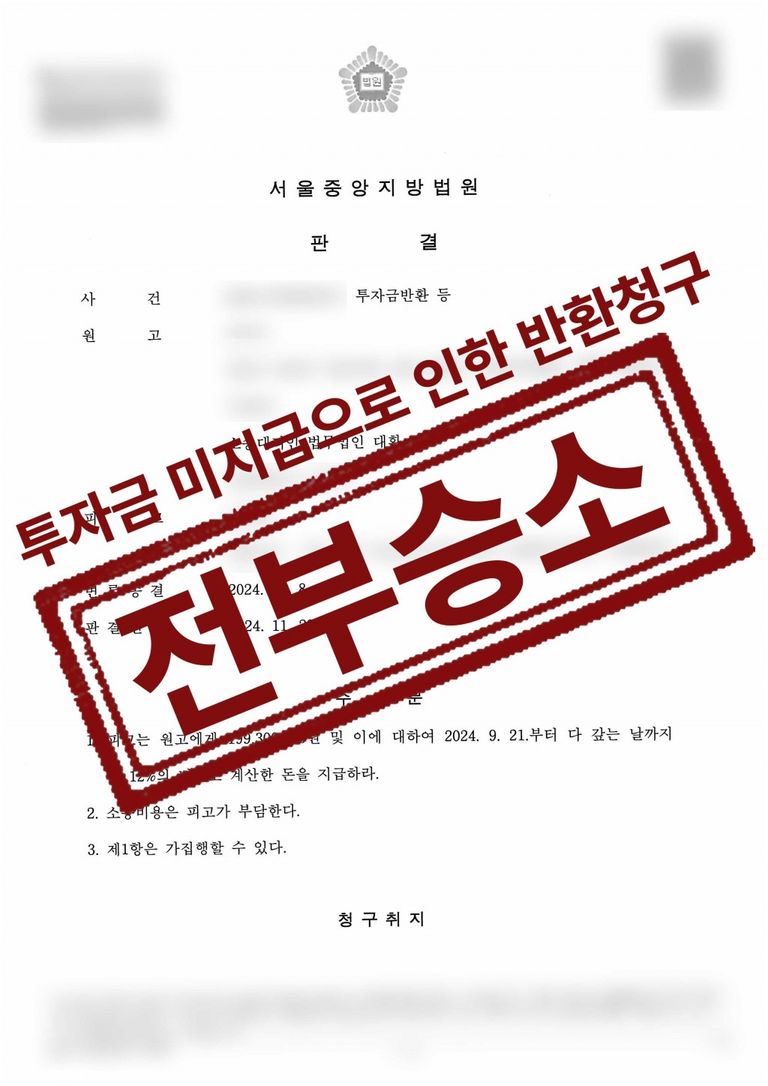 법무법인 대환에서 사실관계를 전부 검토한 결과 투자계약서상에서도 명확히 기재되어 있다는 점, 투자금 이체 내역이 있다는 점 등을 근거로 적극적으로 주장하였으며 이에 투자금 전액을 인정받고 반환 받을 수 있었습니다.