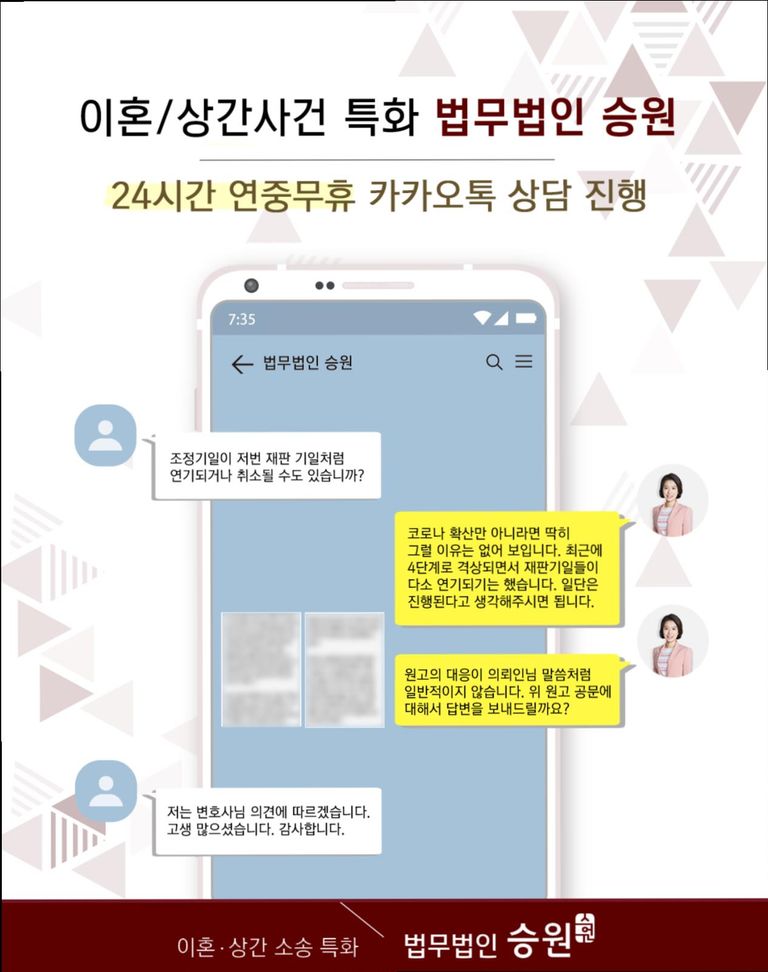 법무법인 승원은 전국 어디든 서울과 동일한 법률 서비스를 제공하며 사무실 방문이 어려운 분들을 위해 카카오톡, 전화 등 비대면 상담 및 사건 수임을 진행하고 있습니다.