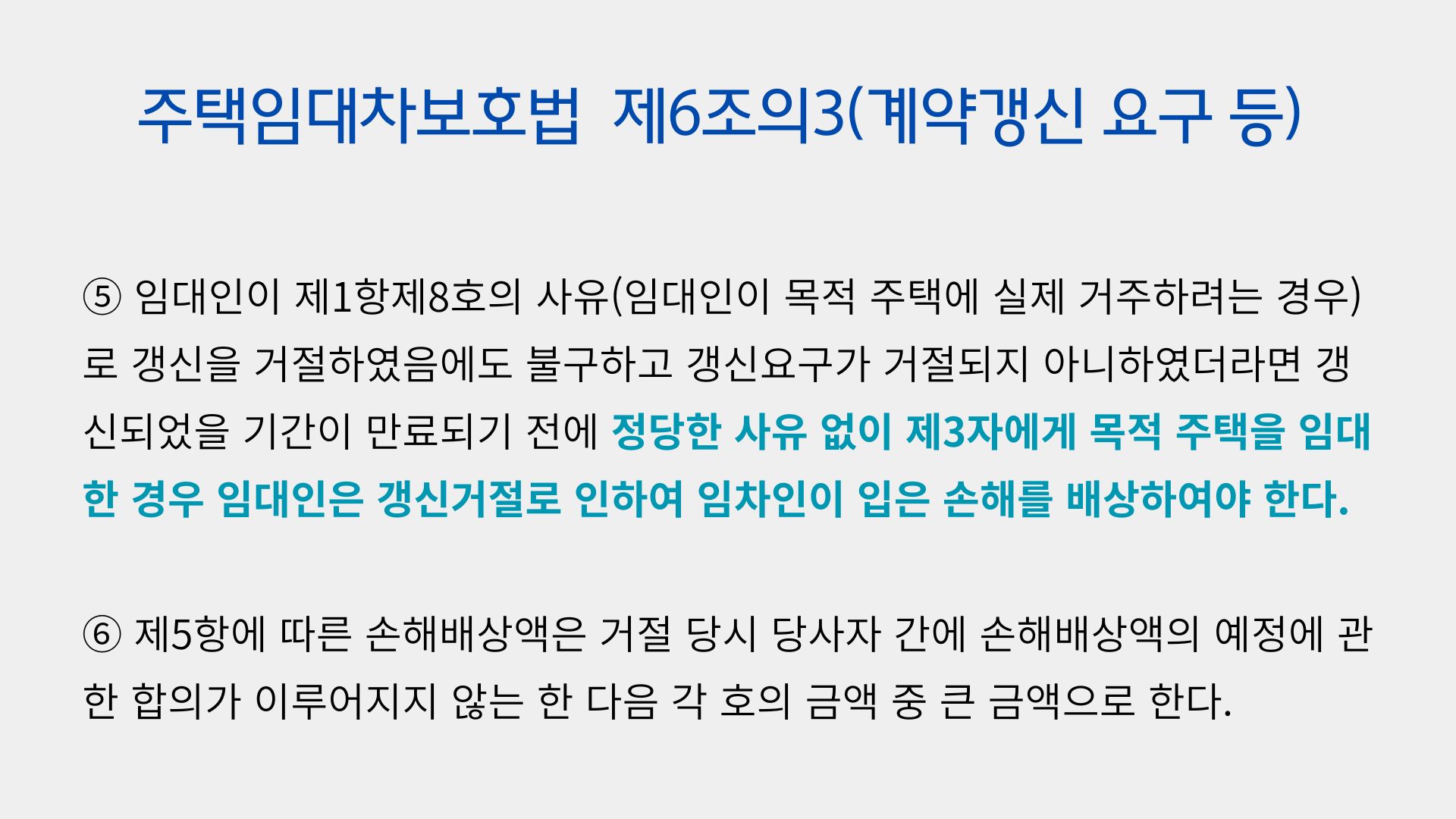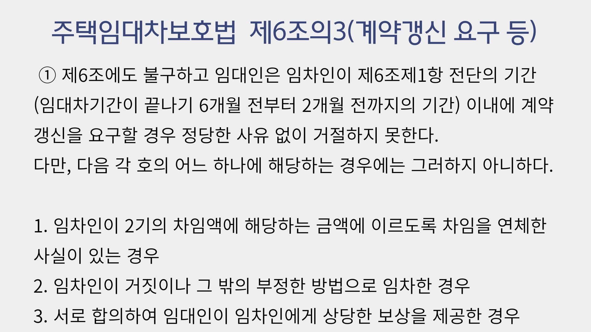 임차인이 차임을 제때 지불하지 않았다거나, 무단으로 임대차목적물을 타인에게 전대하였다는 등 임차인의 과실이 존재하지 않는 이상, 임대인은 임차인의 계약갱신 요구를 거절하기 어려운데요.