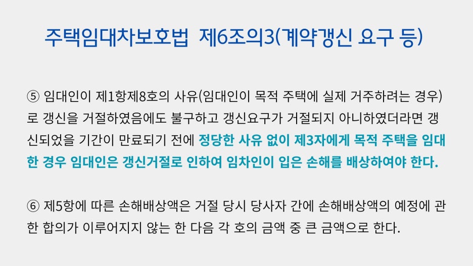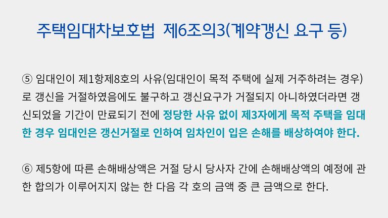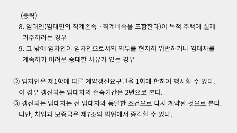 그래서 임대인들이 주로 계약갱신요구권에 대한 거절 사유로 드는 것이 ‘임대인(임대인의 직계존속ㆍ직계비속을 포함한다)이 목적 주택에 실제 거주하려고 한다’는 것입니다. 이 경우 임대차계약은 갱신되지 않습니다.