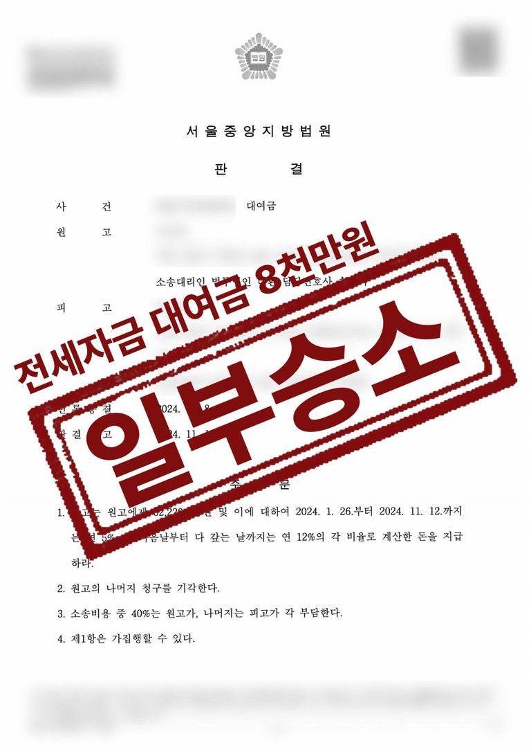 법무법인 대환이 사건을 세세히 살펴본 결과, 처음 피고가 이사를 준비할 시점에 원고에게 먼저 돈을 빌려달라는 메시지를 보냈다는 것과 돈을 이체한 후 감사인사를 한 정황이 있다는 점, 다음달 바로 이사를 했다는 점에서 8천만원은 모두 대여라고 보는 것이 타당하다고 주장하였습니다. 다만, 8천만원 외 비용에 대해서는 명품비용 등을 직접 밝히며 이체했다는 점에서 인정되지 못하였고 이에 1.2억 중 전세자금을 위한 8천만원이 인정되었습니다.