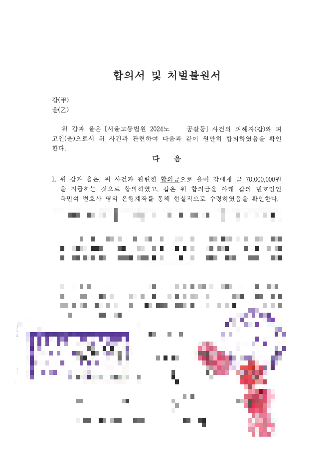 이후 B씨는 새로운 변호인을 선임하여 합의를 제안하였습니다. 저는 A씨가 금전적으로나마 최대한 보상을 받을 수 있도록 적절한 합의전략을 구사하였고, 이러한 저의 조력을 바탕으로 7,000만 원이라는 상당한 금액으로 합의를 이끌어낼 수 있었습니다.