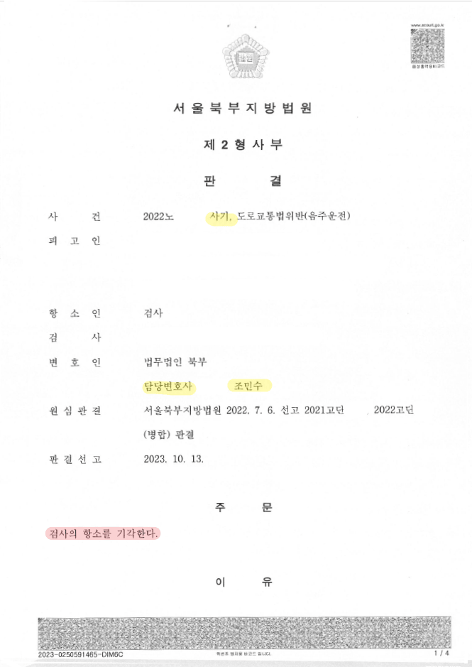 서울북부지방법원에서는 변호인의 의견을 수용하여 사기 부분에 관하여는 무죄를 선고하였고, 이에 검찰이 항소하였으나, 변호인의 적극적인 방어로 항소심에서 검찰의 항소를 기각시켰음.