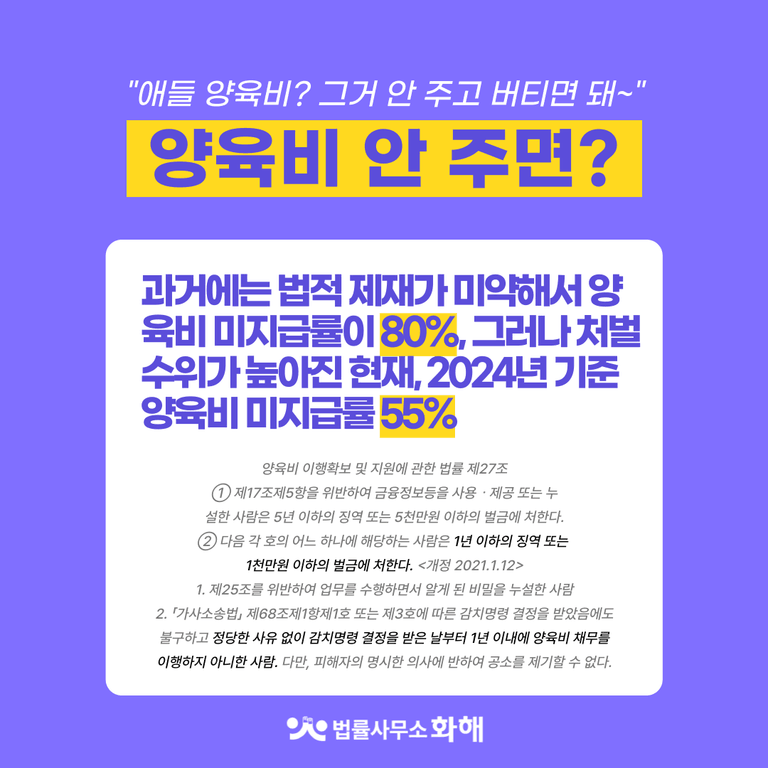 아주 오래전에 이혼한 사람들의 말만 믿고 양육비를 주지 않아도 될까요? 절대 그렇지 않습니다. 과거에는 양육비 미지급에 대한 법적제재가 미약해 양육비를 주지 않는 비율이 80%를 넘었습니다. 말 그대로 안 주고 버티더라도 실질적인 제재 수단이 없어 양육비 지급을 회피하는 경우가 많았죠. 그러나 2021년에 법이 개정되고 처벌 수위가 높아지면서 현재는 미지급률이 눈에 띄게 낮아지고 있는데요.