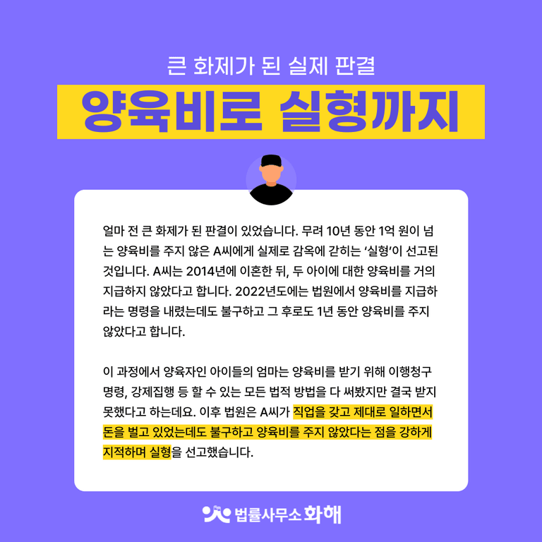 이 과정에서 양육자인 아이들의 엄마는 양육비를 받기 위해 이행청구 명령, 강제집행 등 할 수 있는 모든 법적 방법을 다 써봤지만 결국 받지 못했다고 하는데요. 이후 법원은 A씨가 직업을 갖고 제대로 일하면서 돈을 벌고 있었는데도 불구하고 양육비를 주지 않았다는 점을 강하게 지적하며 실형을 선고했습니다.