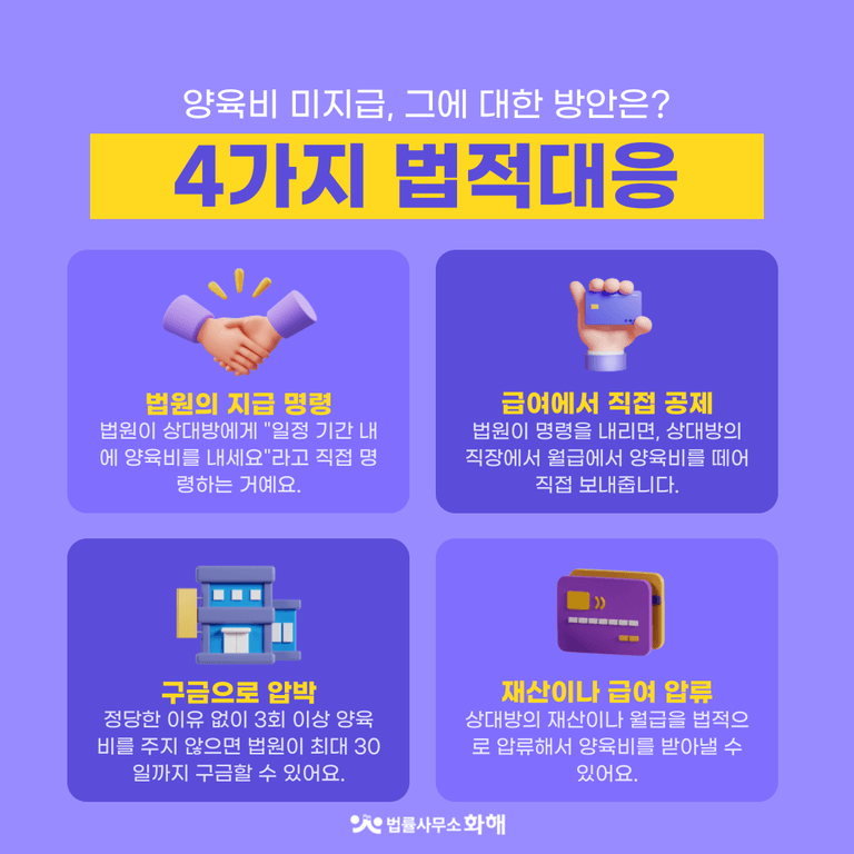 그렇다면 상대방이 양육비를 주지 않을 때, 실질적으로 대응할 수 있는 방법에는 어떤 것들이 있을까요? 법적인 절차를 동원하여 양육비를 받아낼 수 있는 방법은 크게 4가지가 있습니다.