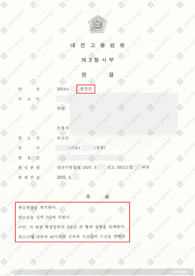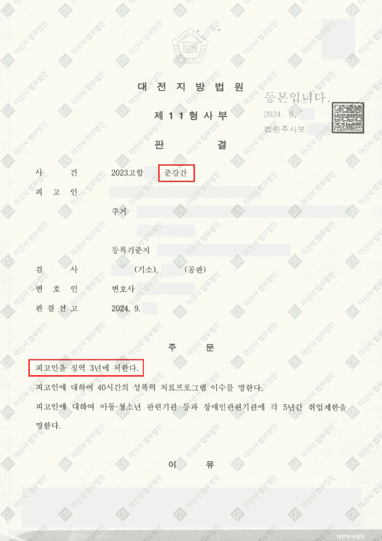 가해자는 1심에서 합의를 하지 않은 상태로 재판을 하였습니다. 본인도 술에 취해 의도한 것이 아니었다는 취지로 대응을 하였으나, 명백한 증거와 더신사 법무법인의 성범죄 피해자 전문 솔루션을 통해 재판을 진행한 결과, 징역 3년이라는 결과를 받게 되었고, 항소심에서 먼저 합의를 원한다고 연락을 주었습니다. 저희는 1심에서 제시한 합의금에 1천만 원을 추가해 합의를 요구하였고 결국 의뢰인은 4500만 원이라는 금액에 합의를 할 수 있었습니다.