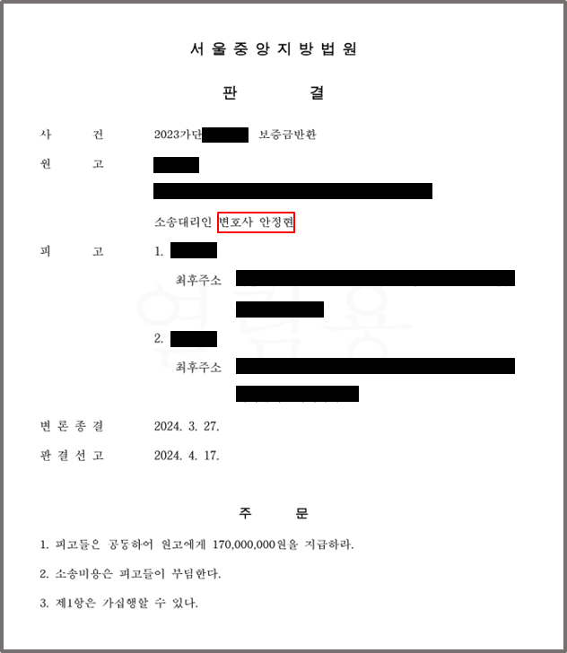 임대인에 대한 집행권원을 확보하기 위해 보증금반환청구소송을 진행하였고 소송진행 이후 판결문을 받게 되었습니다.
