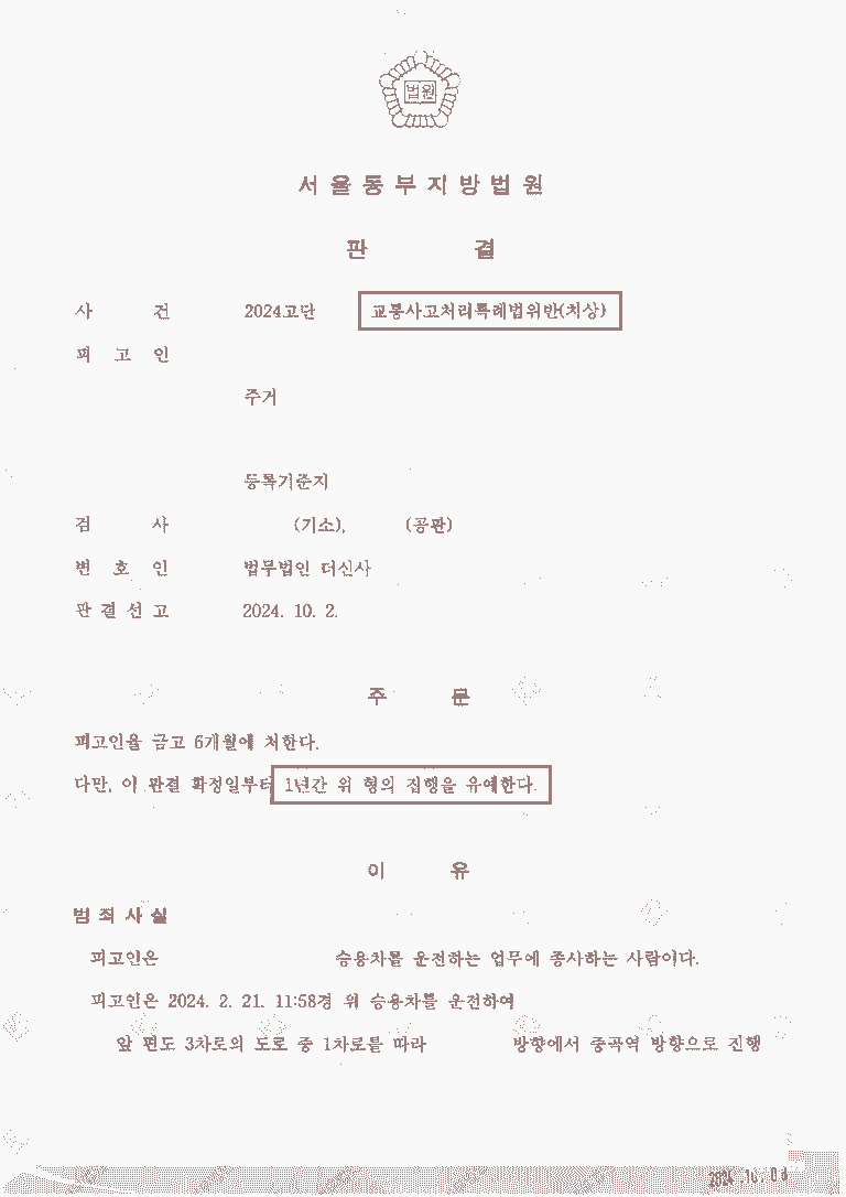 과거 음주를 포함한 교통사고 전력이 전혀 없던 의뢰인은 당황하여 어떻게 대응해야 할 지 모르고 있었습니다. 저희는 우선 당황한 의뢰인을 케어하며, 사건 당시의 cctv 와 목격자에 대한 검토를 통해 혐의 자체에 대한 부인이 어려운 부분을 통해 최대한의 양형자료를 제출하였고, 피해자와의 합의도 진행하였습니다. 또한 진술에 대비하여 사전 시뮬레이션 진행을 통해 준비를 하였습니다. 결국 저희의 바람대로 의뢰인은 집행유예라는 성공적인 결과를 받게 되었습니다.