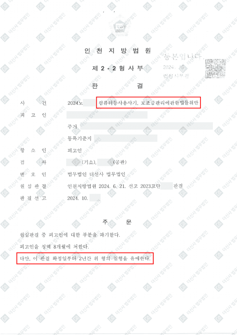 사안 자체가 혐의를 부인하기 어려운 상황이었고, 가장 큰 문제는 의뢰인이 조직적인 범죄의 실행에 있어 매우 밀접한 연관이 있다는 점이었습니다. 그리하여 저희는 의뢰인의 경제적으로 어려운 사정과 순간적인 충동으로 저지른 범죄이며 초범이라는 것에 집중하여 변호를 진행하였고 1심에서는 징역형이 나왔으나,결국 의뢰인은 항소 단계에서 다행히도 집행유예라는 성공적인 결과를 받게 되었습니다.