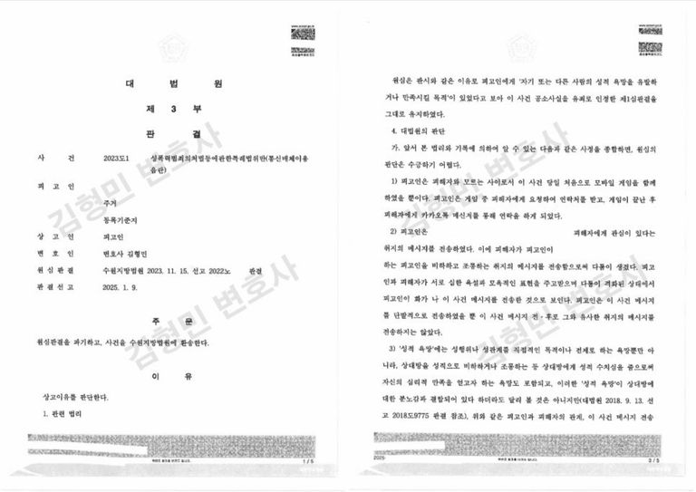 대법원에서 통신매체이용음란죄, 통매음으로 파기환송 판결을 받았습니다.