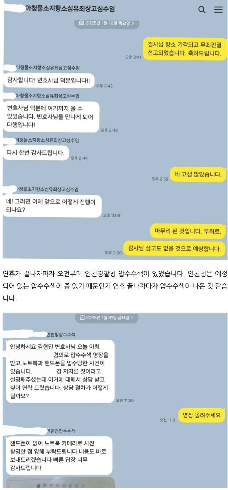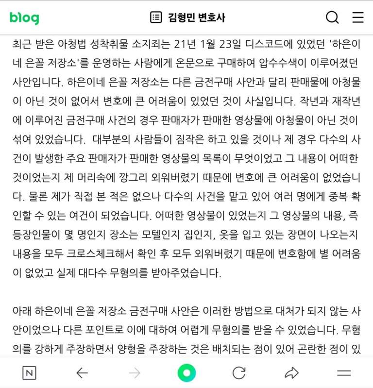 무슨 카드를 가지고 있는지 정확한 파악도 없이 협의해서 나가게 되면 10분도 되지 않아 뭔가 잘못되었음을 느끼는 경우가 흔히 있습니다. N번방, 박사방 사건에서도 다른 변호사를 선임한 이후 저로 변호사를 교체한 경우가 다수 있었습니다. 이전 변호사와 협의한 내용을 읊어보라고 하였는데 이 진술은 이러한 증거가 있어서 안 되고, 저 진술은 이렇게 반박하면 이렇게 대답해야 한다는 등 수정할 부분이 다수 있었던 것을 직접 경험하기도 하였습니다. 갈림길에서 진술이 한 번만 잘못되더라도 무혐의가 날아갈 수 있습니다. 이러한 유형의 변호에 경험이 많지 않은, 많더라도 많은 변호사들이 실수를 하는 부분이기도 합니다. 물론 저는 금전구매 사건의 경우 제가 변호하는 사건 중 가장 높은 확률로 무혐의를 받고 있다는 언급을 이전 포스팅들에서 공개적으로 밝히기도 하였고 실제 어디까지 증거가 있을 것인지 거의 파악하고 있기는 하나, 이러한 상황에서도 의뢰인의 인생이 걸려 있는 만큼 만전을 기하고자 여러 번 가는 불편함을 감수하고 있습니다. 명절 연휴 기간에는 압수수색이 나오지 않으나 토요일, 일요일에는 원래 압수수색이 흔하게 이루어지고 있습니다.