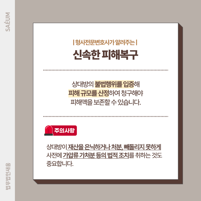 상대방의 불법 행위를 입증하고 피해 규모를 산정하여 청구해야 피해액을 보존할 수 있기 때문입니다. 또한, 상대방이 재산을 은닉하거나 빼돌리지 못하도록 가압류·가처분 등의 법적 조치를 취하는 것도 중요합니다.