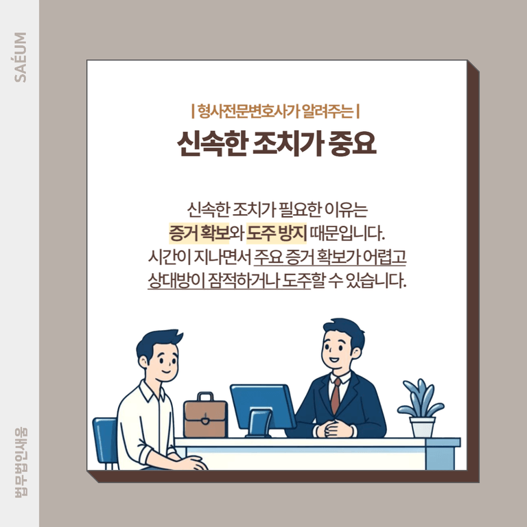 무엇보다 신속한 대응이 필요한 이유는 증거 확보와 도주 방지입니다. 시간이 지나면서 영상·목격자 증언 등 주요 증거가 소멸될 가능성이 있으며, 대응이 늦어지면 상대방이 잠적하거나 도주하여 처벌이 어려워질 수도 있습니다. 이에 가능한 한 빠르게 대응하여 피해를 최소화하는 것이 중요합니다.