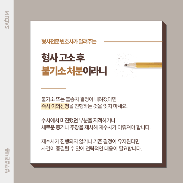 불기소 또는 불송치 결정이 내려졌다면, 즉시 이의신청을 진행하는 것이 중요합니다. 이때 결정문을 면밀히 검토하여 수사가 미진했던 부분을 지적하거나, 새로운 증거 및 주장을 제시하여 재수사가 이루어질 수 있도록 해야 합니다. 만약 재수사가 진행되지 않거나, 진행 후에도 기존 결정이 유지된다면 사건이 그대로 종결될 수 있으므로 신중하고 전략적인 대응이 필요합니다.