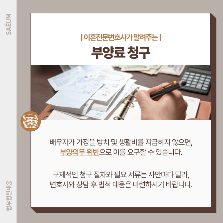 부부 관계를 정리하기로 결심했다면, 부양료 청구와 함께 이혼소송도 신중하게 준비해야 합니다. 단순히 생활비 문제뿐만 아니라 재산분할, 위자료 등도 함께 고려해야 하므로 이혼 절차를 소홀히 해서는 안 됩니다.