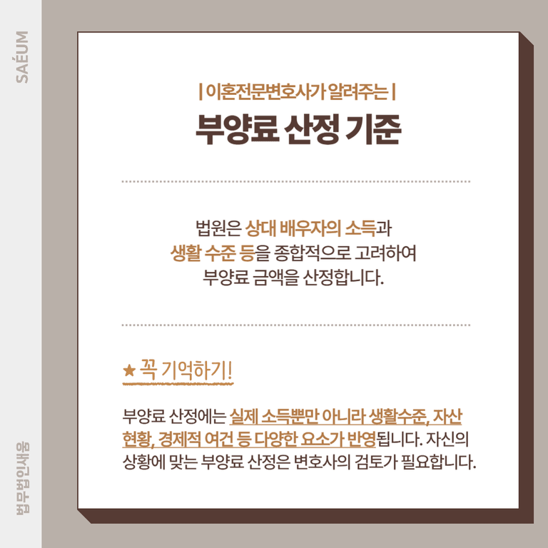 부양료 산정에는 배우자의 실제 소득뿐만 아니라 생활 수준, 자산 현황, 경제적 여건 등 다양한 요소가 반영되므로, 자신의 상황에 맞는 적정 금액을 받기 위해서는 이혼전문변호사의 조력이 필요합니다.