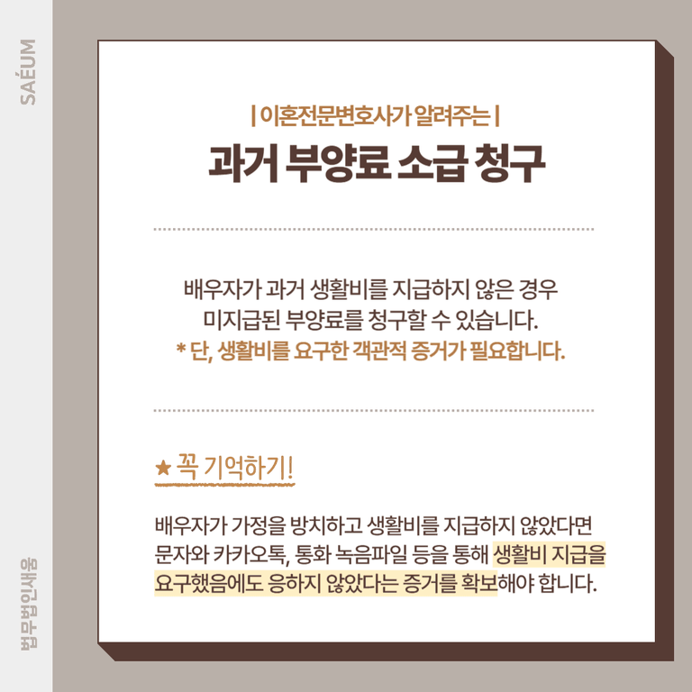 다만, 생활비를 요구했다는 객관적인 증거가 있어야 합니다. 예를 들어, 배우자가 생활비를 주지 않았더라도 별다른 요구 없이 스스로 생활을 유지했다면, 뒤늦게 부양료를 청구하기는 어렵습니다.
