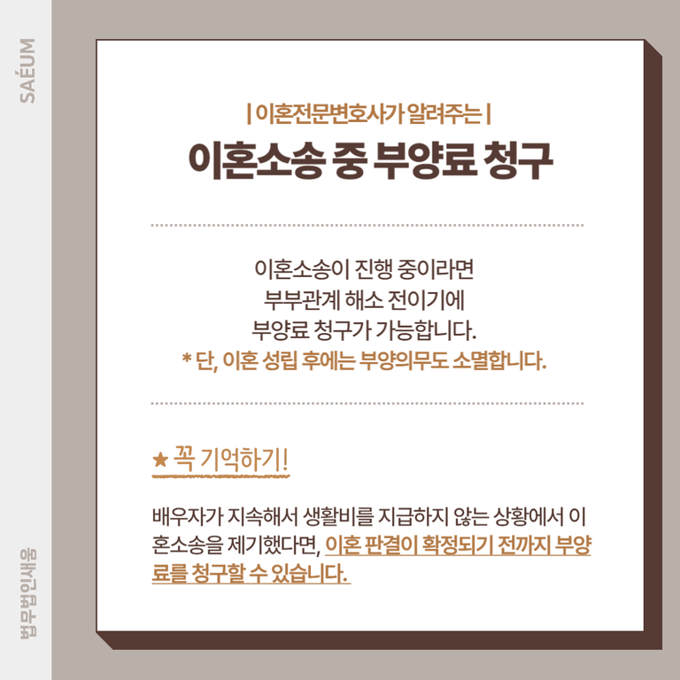 다만, 이혼이 성립된 이후에는 부부 관계가 해소되므로 부양의무도 소멸합니다. 따라서 소송이 끝나기 전에 법률 조언을 받아 자신의 권리를 충분히 보호하는 것이 필요합니다. 이혼전문변호사와 상담하여 부양료 청구 절차를 신속하게 진행하는 것이 바람직합니다.
