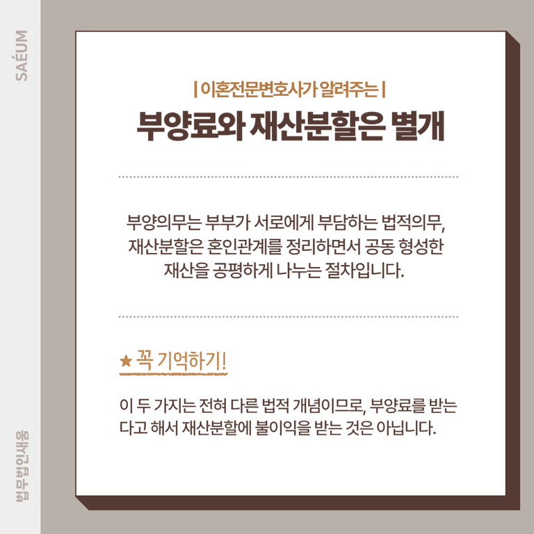 따라서 이혼을 준비하면서 부양료와 재산분할을 혼동해 자신의 권리를 놓치는 일이 없도록 주의해야 합니다.