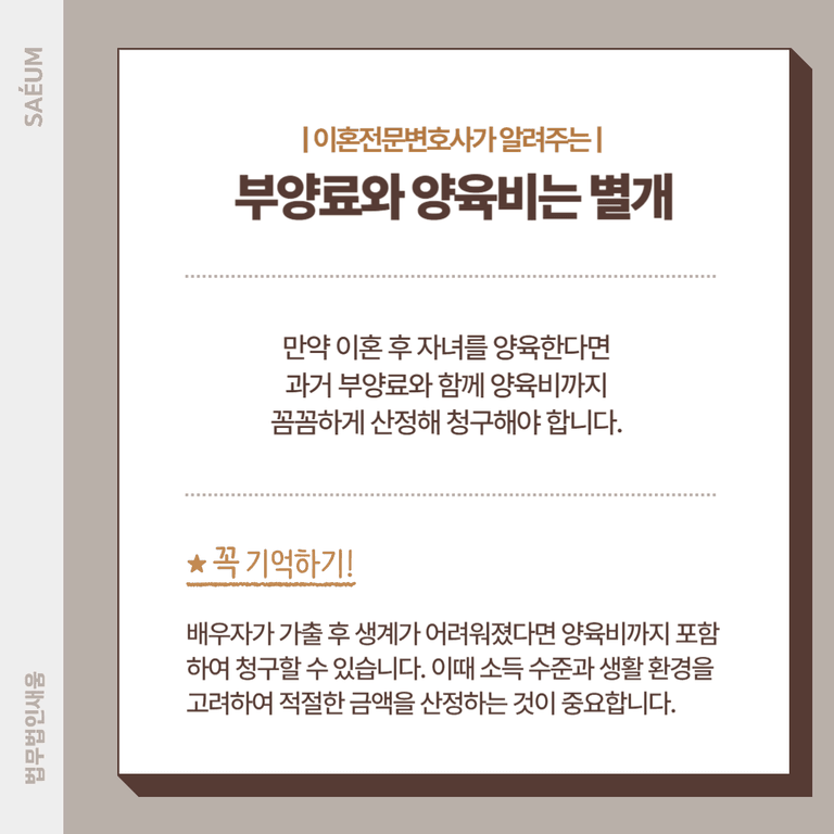 만약 이혼 후 자녀를 양육하게 되었다면, 단순히 배우자로부터 생활비(부양료)만 청구할 것이 아니라, 자녀를 위한 양육비까지 함께 철저히 산정해야 합니다.
