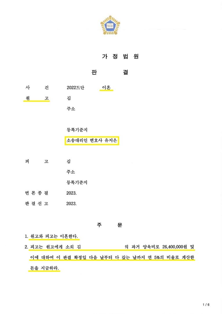 결국 의뢰인이 간절히 원하는 대로 유책배우자였음에도 불구하고 혼인관계가 파탄되었음을 인정받아 이혼이 되었고, 남편으로부터 과거양육비 명분으로 2,600만 원도 지급받으며 성공적으로 마무리 된 사안입니다.