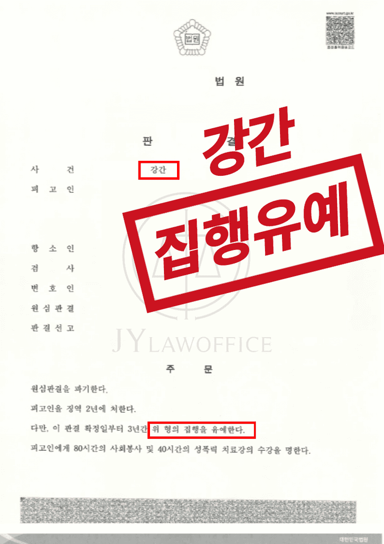 이와 같은 변호인의 조력에 따라, 의뢰인은 강간 혐의에 대하여 최종 집행유예 판결을 받고 사건을 무사히 종결시킬 수 있었습니다.